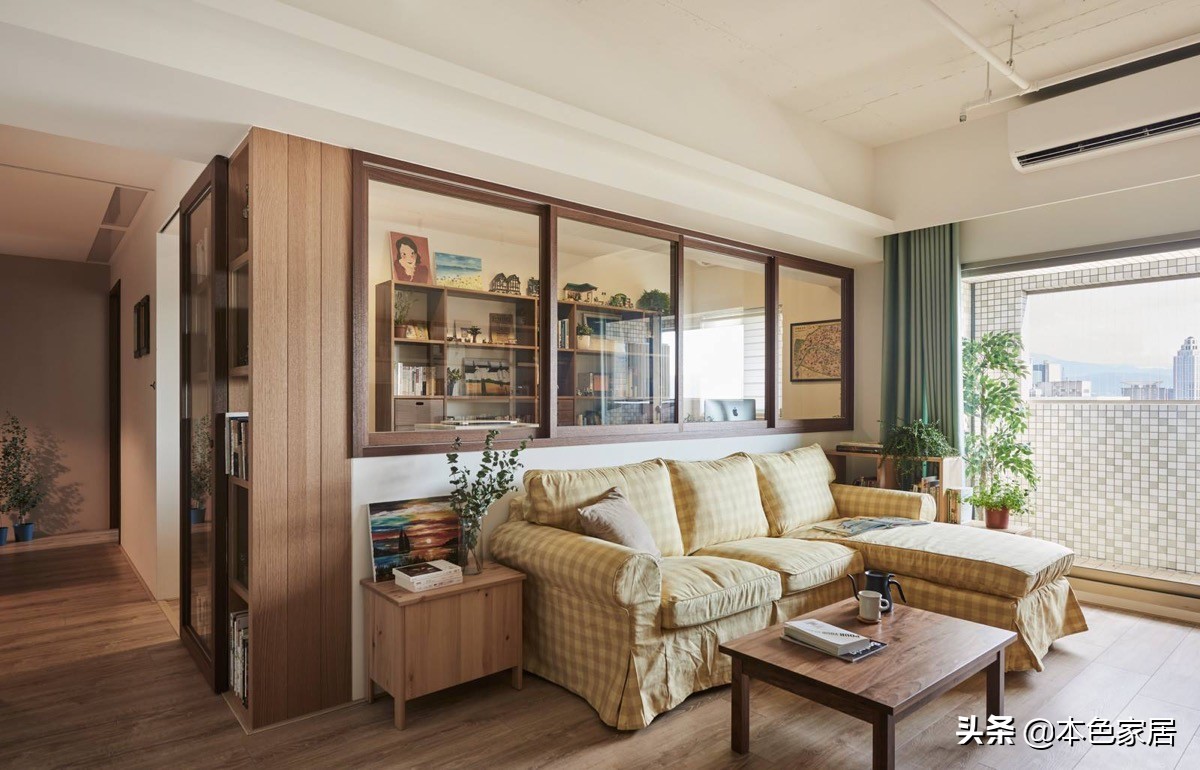 缩小了书房面积,与客厅的上半部分采用玻璃窗,视觉的通透让书房的空间感觉更大,同时引入阳台的自然光线。